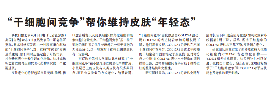 2019-04-12 查看更多科技日?qǐng)?bào)北京4月3日電(記者張夢(mèng)然)英國(guó)《自然》雜志3日在線發(fā)表的一項(xiàng)老化研究稱,日本科學(xué)家發(fā)現(xiàn)由一種膠原蛋白驅(qū)動(dòng)的“干細(xì)胞…