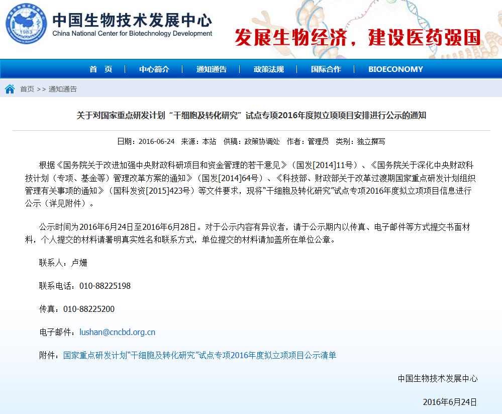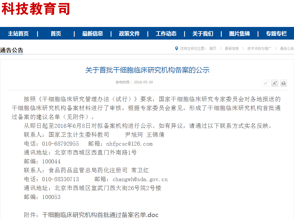 2016-06-24 查看更多按照《干細(xì)胞臨床研究管理辦法(試行)》要求,國(guó)家干細(xì)胞臨床研究專家委員會(huì)對(duì)各地報(bào)送的干細(xì)胞臨床研究機(jī)構(gòu)備案材料進(jìn)行了審核,根據(jù)專家委員會(huì)意見(jiàn),形成了干細(xì)胞臨床研究機(jī)構(gòu)首批通過(guò)備案的建議名單(見(jiàn)附件)。 從即日起至2016年6月8日對(duì)擬備案機(jī)構(gòu)進(jìn)…