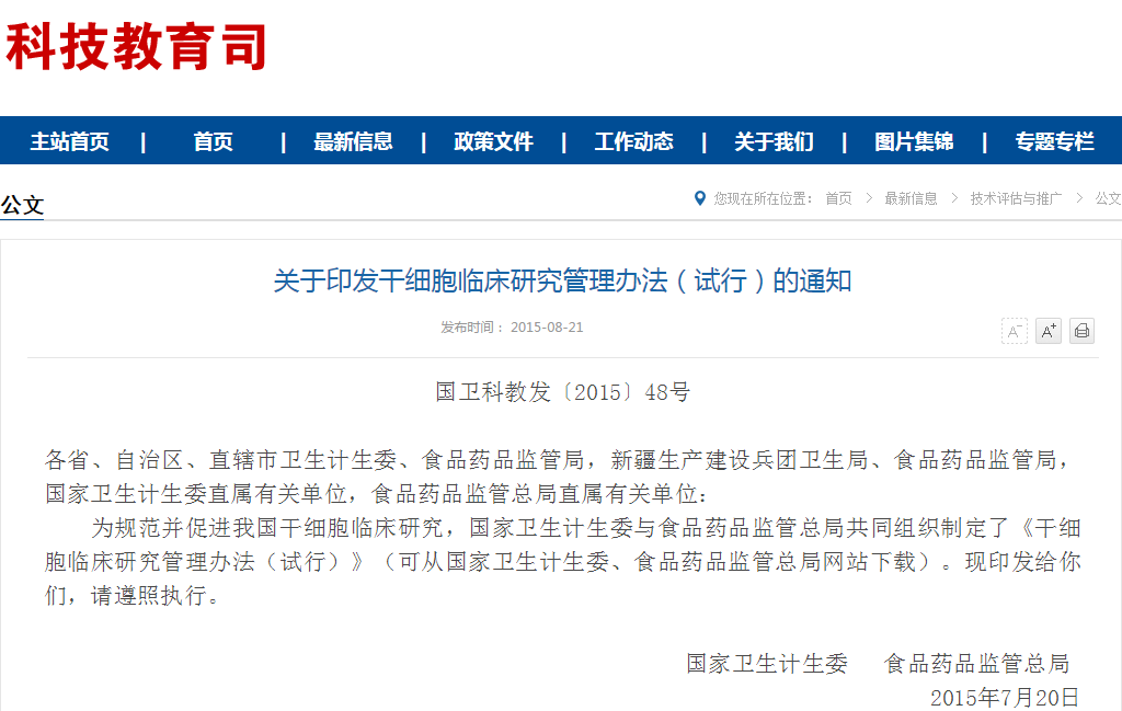 2015-07-31 查看更多各省、自治區(qū)、直轄市衛(wèi)生計(jì)生委、食品藥品監(jiān)管局,新疆生產(chǎn)建設(shè)兵團(tuán)衛(wèi)生局、食品藥品監(jiān)管局,國家衛(wèi)生計(jì)生委直屬有關(guān)單位,食品藥品監(jiān)管總局直屬有關(guān)單位: 為規(guī)范并促進(jìn)我國干細(xì)胞臨床研究,國家衛(wèi)生計(jì)生委與食品藥品監(jiān)管總局共同組織制定了《干細(xì)胞臨床…