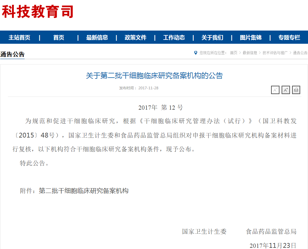 2018-01-01 查看更多截止至2017年11月28日,我國(guó)一共有102家醫(yī)院(干細(xì)胞臨床研究機(jī)構(gòu))通過備案。附件: